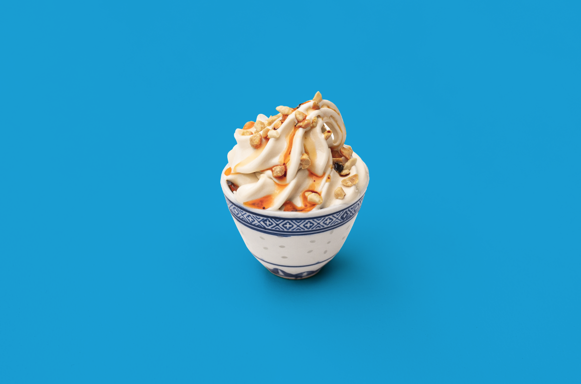 GLACE À LA CACAHUÈTE RÉALISÉE AVEC GLAZED. CHILI OIL MAISON ET CRUNCHY PEANUTS EN TOPPING.