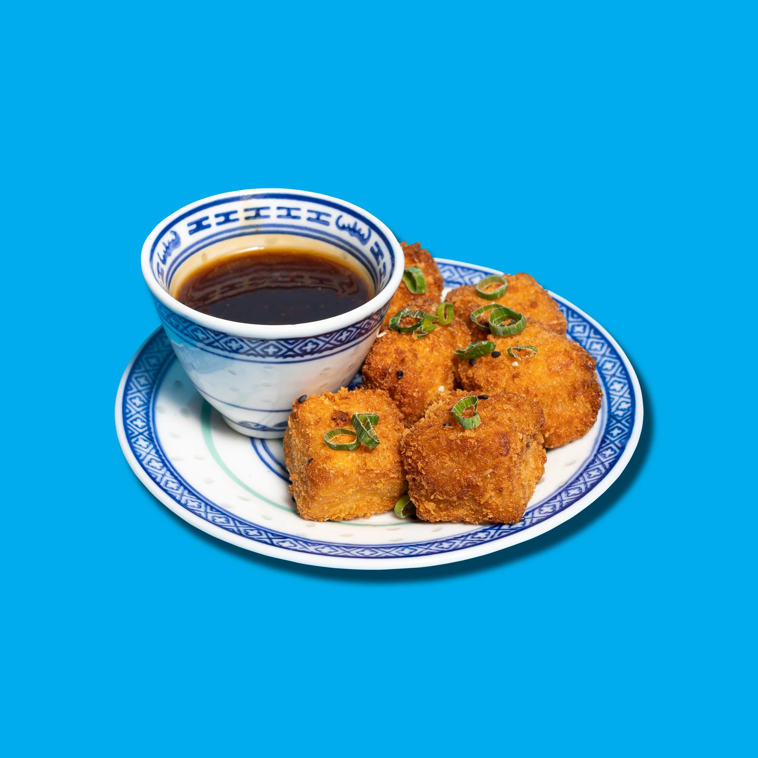 Tofu frit, sauce à l'ail maison, sésame.