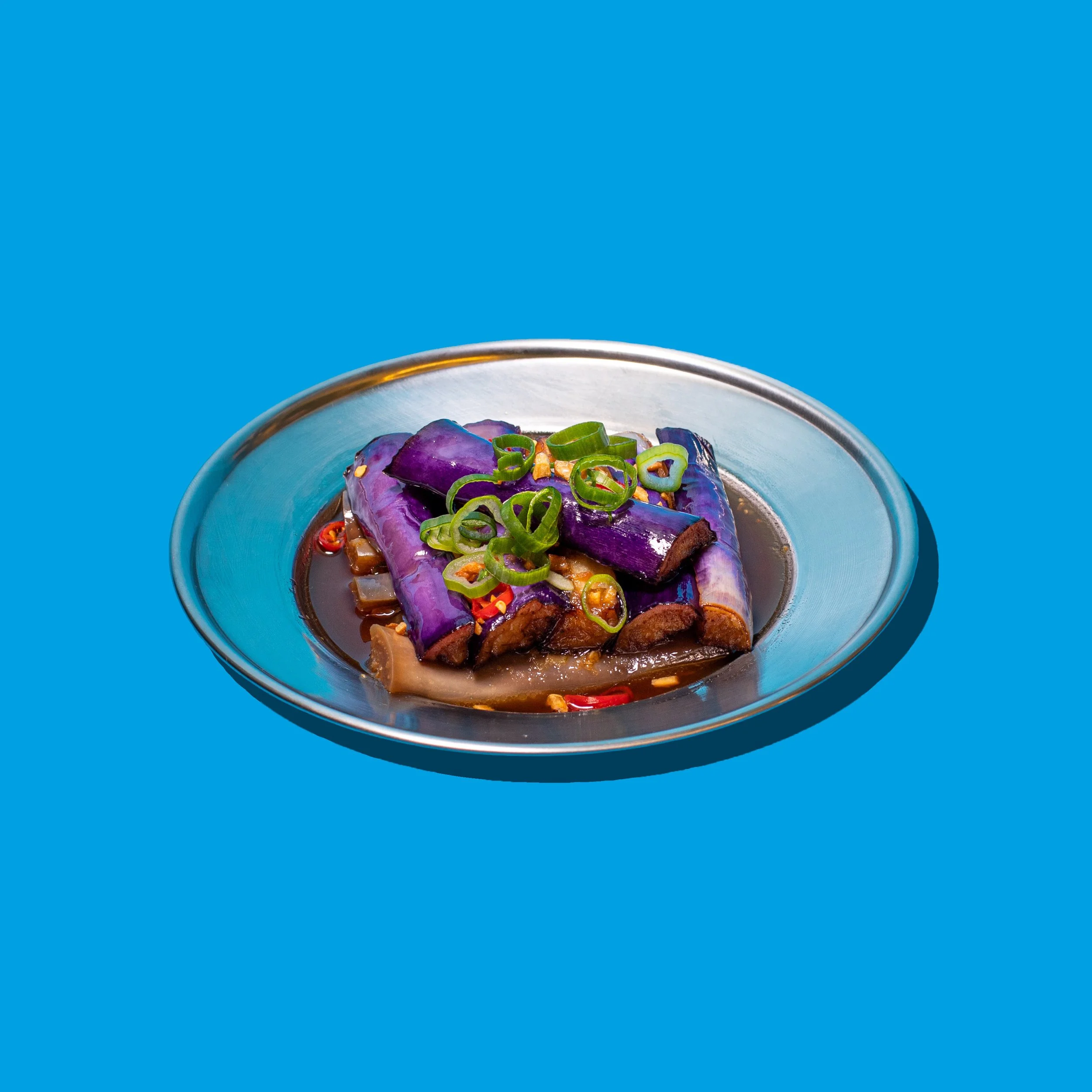 Meltingly soft eggplants. Amazing garlic dressing. Careful, slightly spicy.
