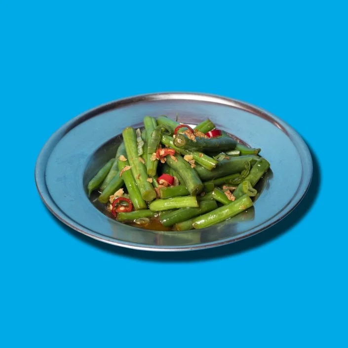SALADE DE HARICOTS VERTS FRAIS ET CROQUANTS, VINAIGRETTE LÉGÈRE À L'AIL, CITRON ET CHILI OIL.