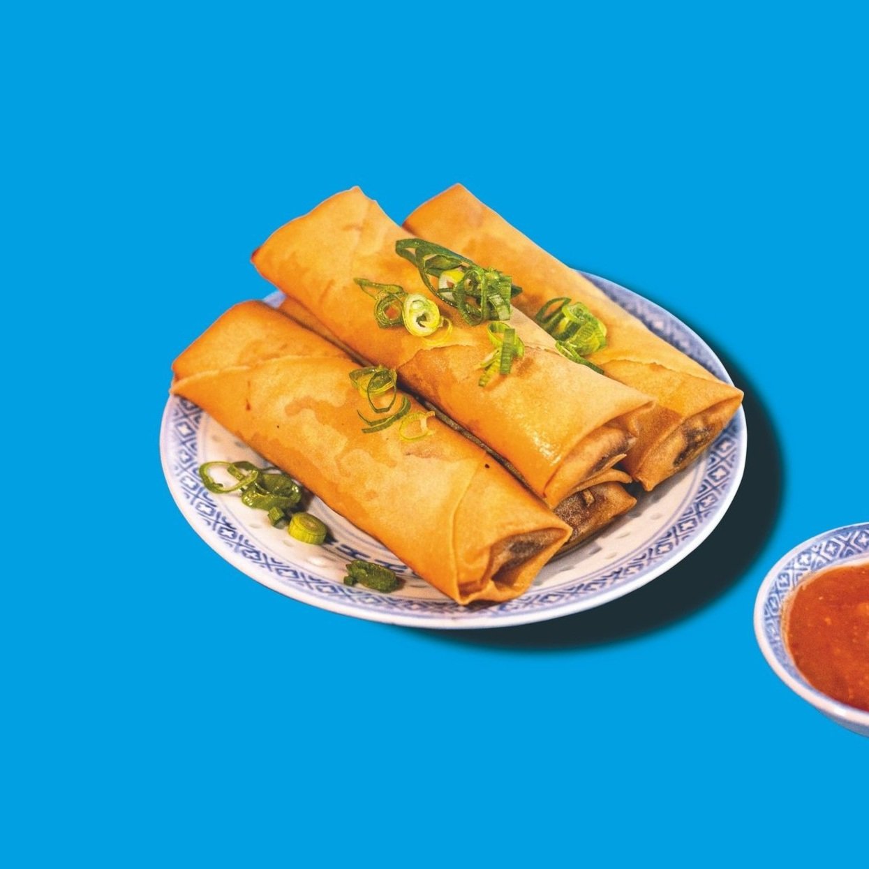 CRISPY SPRING ROLLS WITH VEGETABLES, SHIITAKE, SOY BEAN SPROUTS, CABBAGE, RICE VERMICELLI
