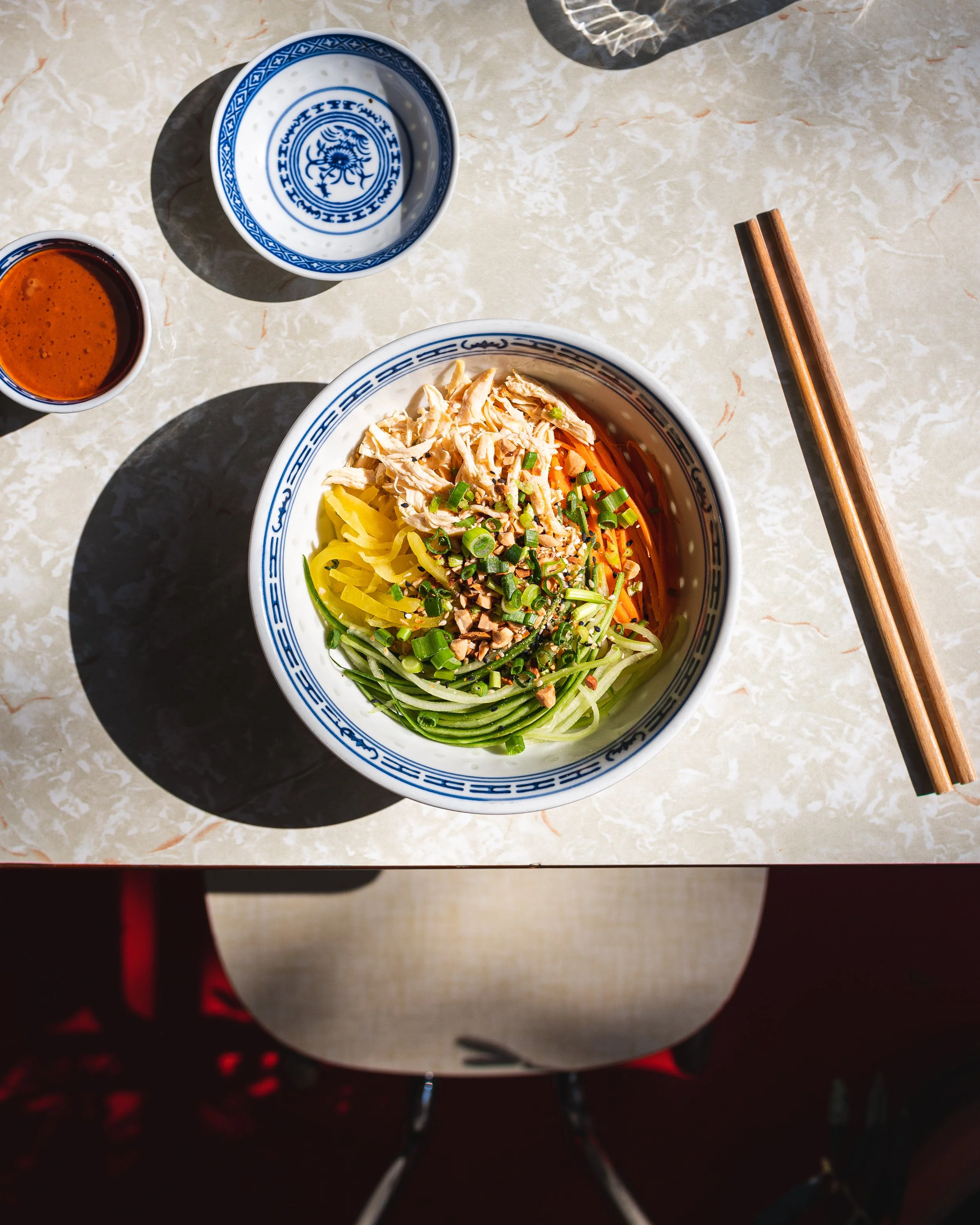 COLD NOODLES, SESAME SAUCE, SHREDDED CHICKEN, CUCUMBER AND CARROTS JULIENNE STRIPS,