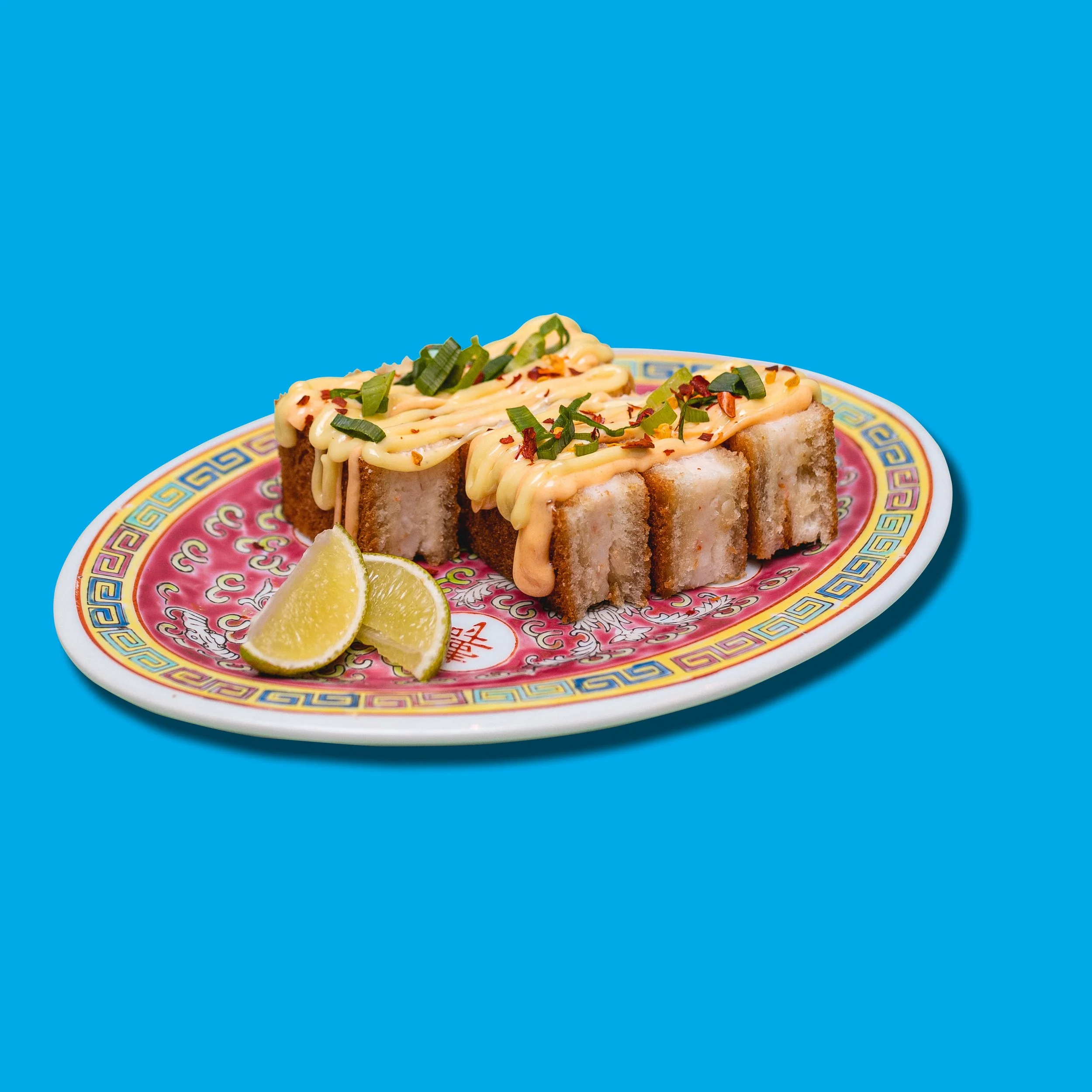 Petits toasts frits à la crevette, mayonnaise au sriracha maison et wasabi, citron vert.