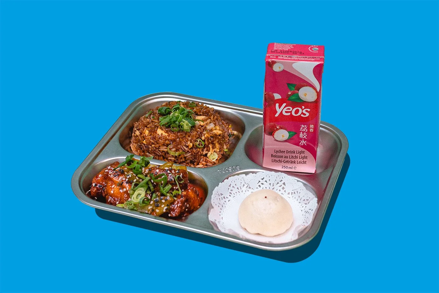 Chao Fan (riz sauté au wok, oeufs et sauce soja) + Poulet sweet & Sour + Mini Bao Choco + brique de jus de leetchi Yeo.