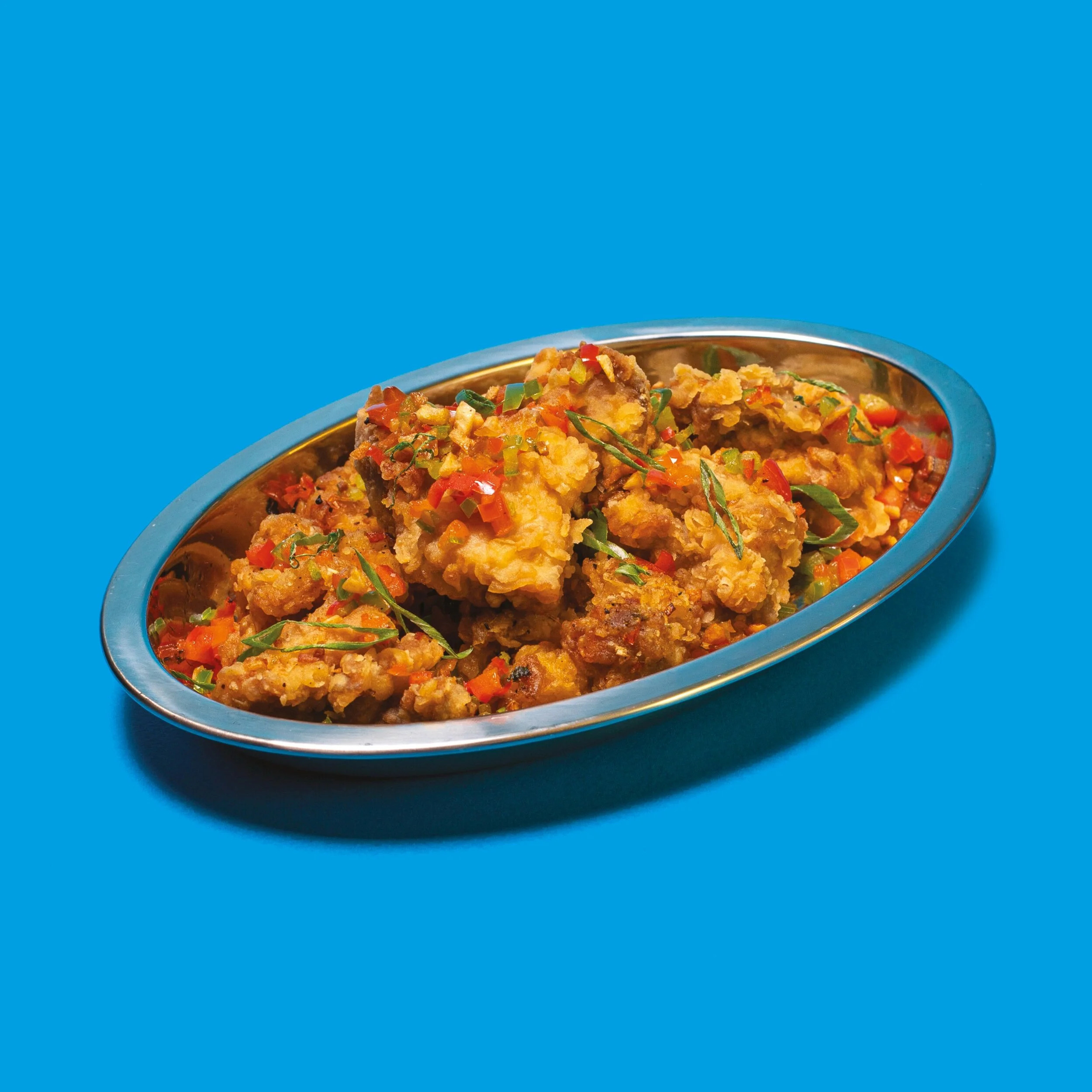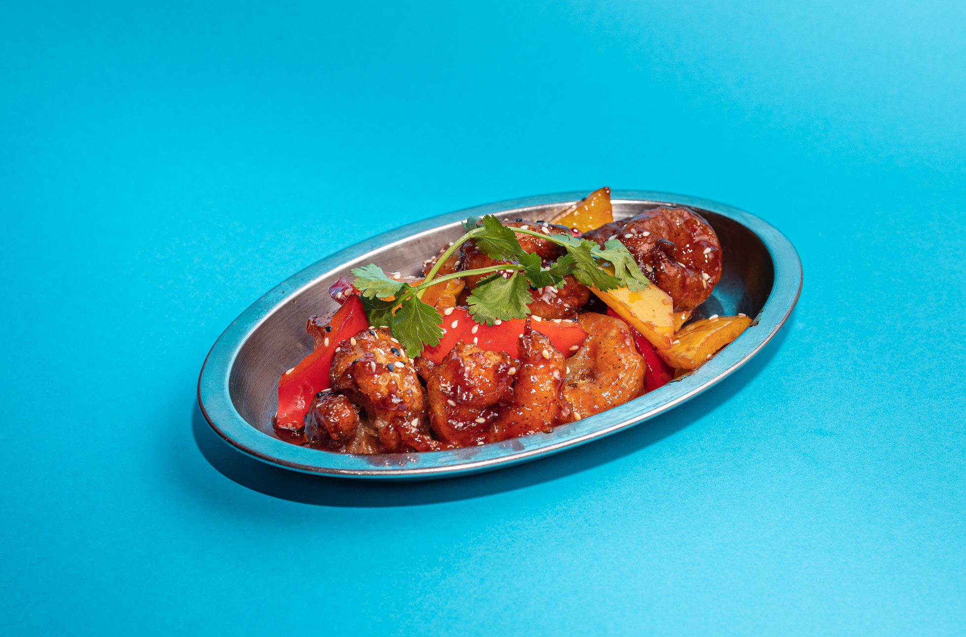 CREVETTES ET LEUR PANURE CROUSTILLANTE SAUTÉES AU WOK AVEC UNE SAUCE AIGRE DOUCE, DES POIVRONS ET DES OIGNONS.